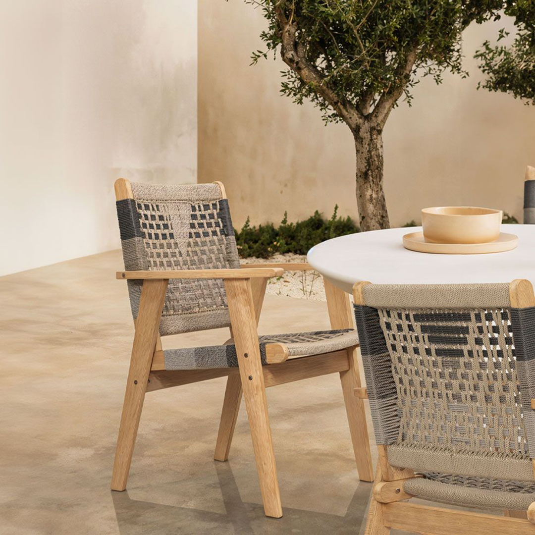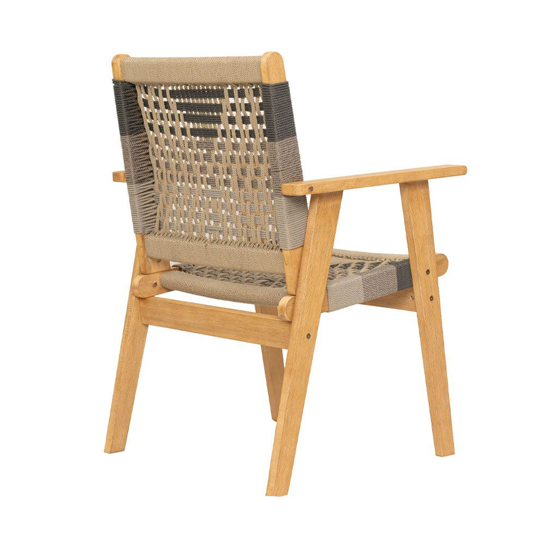Η πλεξ στυλ καρέκλα ενσωματώνει φυσική κομψότητα και σύγχρονη αισθητική, αποτελώντας μια εκλεπτυσμένη επιλογή για κάθε χώρο. Κατασκευασμένη από μασίφ ξύλο ακακίας σε φυσική απόχρωση, αποπνέει ζεστασιά και ανθεκτικότητα. Το κάθισμα και η πλάτη της είναι πλεγμένα με ανθεκτικό σχοινί σε γήινες αποχρώσεις, δημιουργώντας μια εκλεπτυσμένη υφή που συνδυάζει τη λειτουργικότητα με το υψηλό design. Ο άνετος σχεδιασμός και τα κομψά μπράτσα την καθιστούν ιδανική για χαλάρωση τόσο σε εσωτερικούς όσο και σε εξωτερικούς χώρους. Η καρέκλα αυτή είναι η τέλεια προσθήκη για όσους αναζητούν ποιότητα, αντοχή και διαχρονικό στυλ.