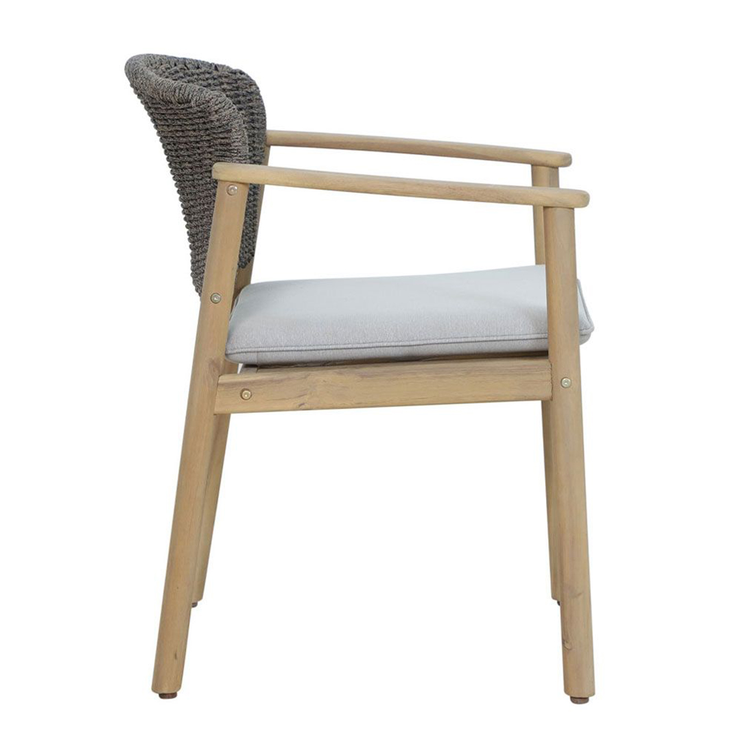 Ομορφη καρέκλα που αποτελεί έναν εκλεπτυσμένο συνδυασμό φυσικών υλικών και μοντέρνας αισθητικής. Ο σκελετός της είναι κατασκευασμένος από ανθεκτικό ξύλο ακακίας σε ζεστή φυσική απόχρωση, προσφέροντας σταθερότητα και διαχρονική γοητεία. Η πλάτη από υψηλής ποιότητας σχοινί σε γκρι απόχρωση χαρίζει μοναδικό στυλ και εξαιρετική στήριξη, ενώ το άνετο μαξιλάρι με λινό ύφασμα ενισχύει την αίσθηση πολυτέλειας. Ιδανική για εσωτερικούς και εξωτερικούς χώρους, η καρέκλα αυτή συνδυάζει κομψότητα και άνεση, αναβαθμίζοντας κάθε περιβάλλον