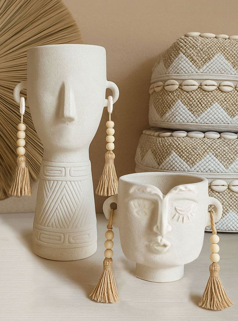 Κεραμικό βάζο σε μπεζ απόχρωση, εντυπωσιάζουν με τον ξεχωριστό τους σχεδιασμό που εμπνέεται από tribal μοτίβα. Η ανάγλυφη υφή και οι κομψές λεπτομέρειες, όπως τα κρεμαστά διακοσμητικά στοιχεία από φυσικά υλικά, προσδίδουν μια ethnic αλλά και μοντέρνα αισθητική. Ιδανικά για τη διακόσμηση εσωτερικών χώρων, τα βάζα αυτά συνδυάζουν τη λειτουργικότητα με την τέχνη, δημιουργώντας μια αίσθηση ζεστασιάς και μοναδικότητας. Αποκλειστικά διακοσμητική χρήση – δεν ενδείκνυται η χρήση νερού