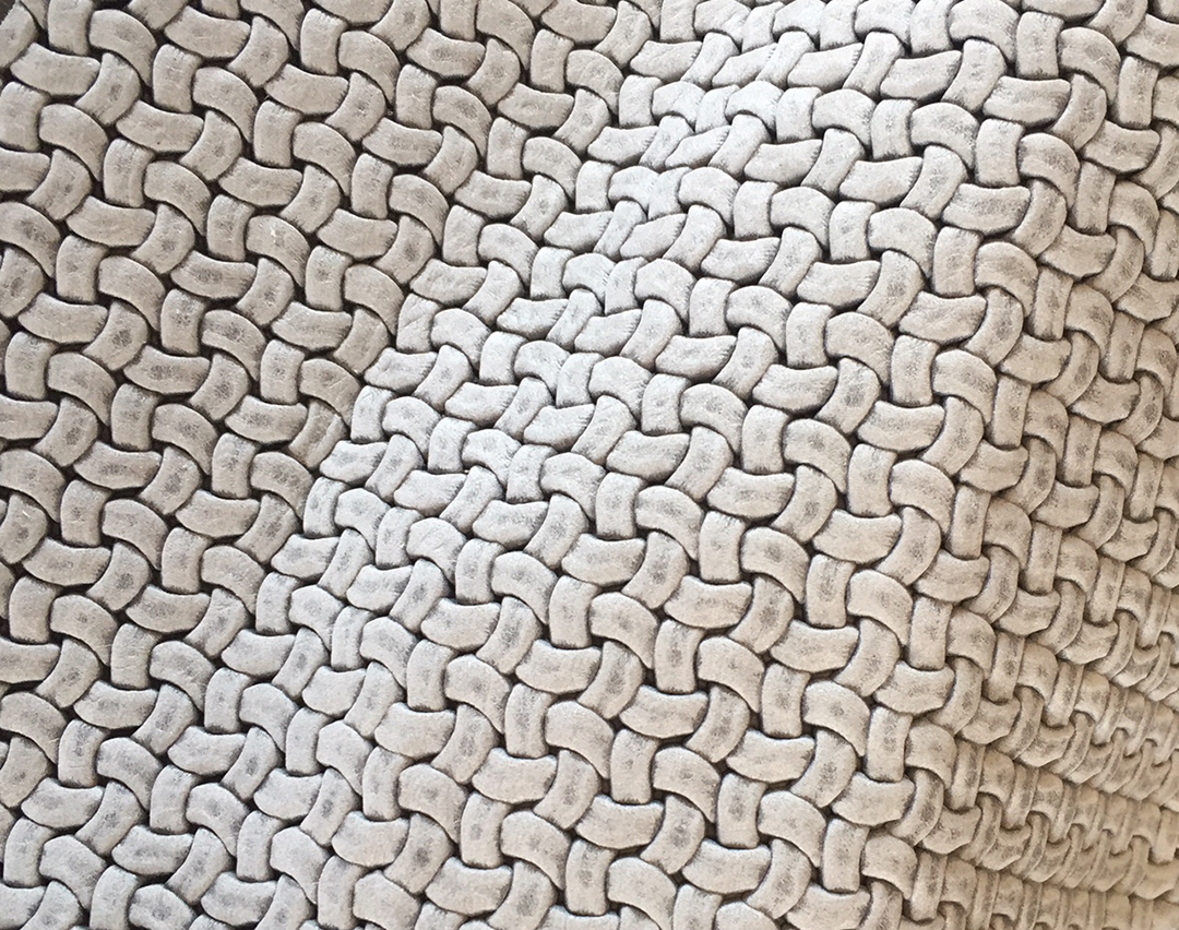 Top grain european bovine leather, aniline dyed with a soft, velvety surface. Geometric embossing.