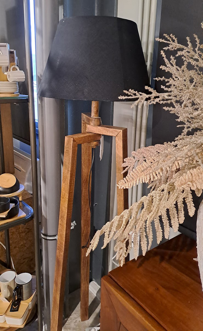 Το φωτιστικό συνδυάζει φυσικό ξύλο με μαύρο υφασμάτινο καπέλο, δημιουργώντας μια ζεστή και γήινη αισθητική. Η τριποδική του βάση προσθέτει αρχιτεκτονική ισορροπία και το κάνει ιδανικό για cozy γωνιές ανάγνωσης, σαλόνια και υπνοδωμάτια με μοντέρνο boho ύφος